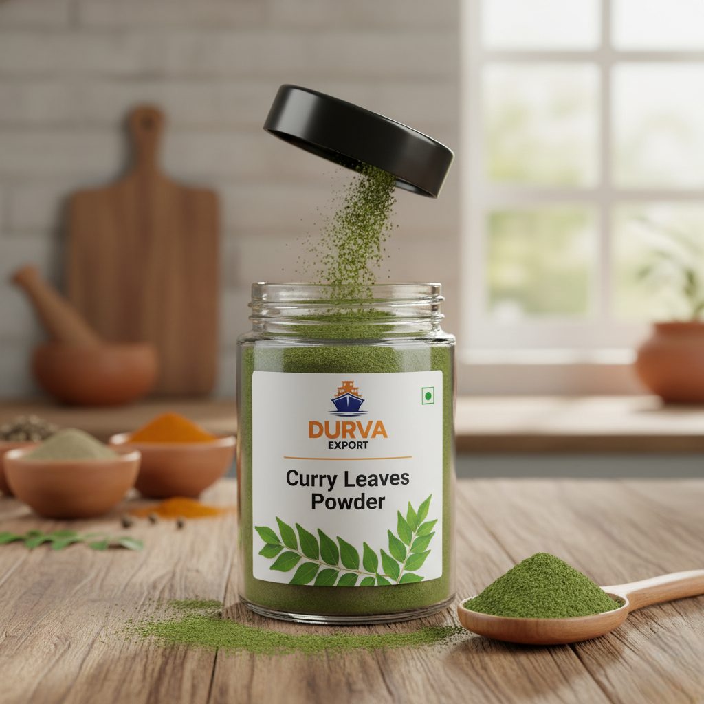 Durva Export’s Curry Leaves Powder is made from fresh, aromatic curry leaves that are carefully cleaned, shade-dried, and finely ground under hygienic processing standards. This 100% natural powder retains the distinct aroma, earthy flavor, and nutritional benefits of curry leaves. Known for its digestive, antioxidant, and immunity-supporting properties, Curry Leaves Powder is widely used in spice blends, South Indian dishes, ready-mix foods, chutneys, and health formulations. With its long shelf life and consistent quality, it is ideal for both household and industrial use.