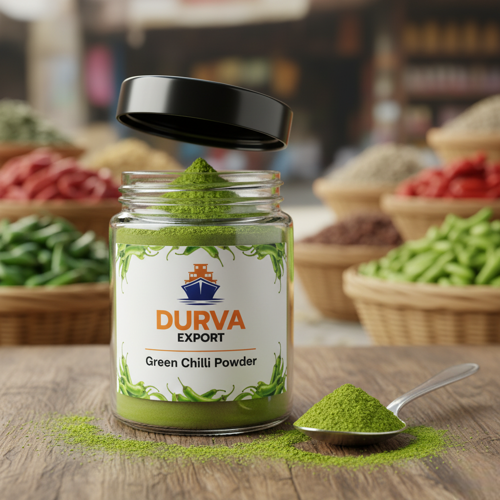 Durva Export’s Green Chilli Powder is made from fresh, premium-quality green chillies that are cleaned, dehydrated, and finely ground to preserve their natural heat, vibrant color, and fresh aroma. This 100% natural powder adds a consistent, spicy flavor to various food applications without the hassle of handling fresh chillies. Widely used in spice mixes, snacks, curries, chutneys, and ready-to-cook meals, it offers long shelf life, easy blending, and uniform pungency—ideal for both household and industrial use.