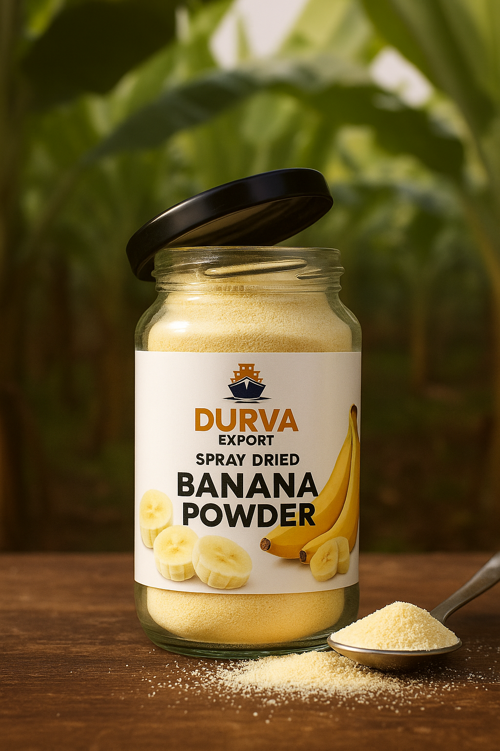 Durva Export’s Spray Dried Banana Powder is produced from fresh, ripe bananas using advanced spray-drying technology to preserve their natural flavor, aroma, sweetness, and nutrients. This fine, free-flowing powder is 100% natural and dissolves easily, making it ideal for beverages, baby foods, bakery items, desserts, and health products. With long shelf life, consistent quality, and excellent taste retention, it is widely preferred by food processors and nutraceutical manufacturers.